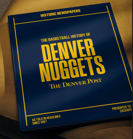 Step into the action-packed history of the Denver Nuggets with a personalized newspaper book featuring authentic headlines from the Denver Post. From the team’s early ABA days and the 1976 ABA-NBA merger to thrilling playoff runs and the rise of stars like Alex English, Carmelo Anthony, and Nikola Jokić, this hardcover keepsake captures the drama and unforgettable moments of Nuggets basketball as they happened. Each page immerses fans in the milestones that shaped the franchise.